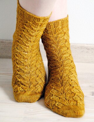 The pattern features a gusset-and-flap heel construction that doesn’t require picking up stitches. Right and left socks are identical, perfect for working socks two at a time.