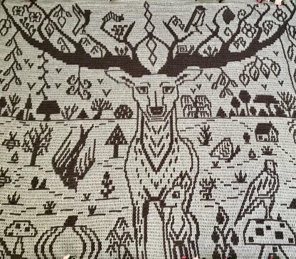 Thanks for your interest in Enchanted Deer Spirit. I wanted to create a blanket with a touch of magical enchantment with the deers antlers being oversized and containing creatures, flowers and birds, I hope that you like the design and create your own.