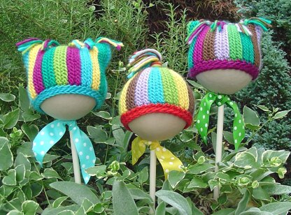Perfect whimsical hats for using lots of color. The pesky yarn ends create unique embellishments (no weaving in!) . . . swell endings for two quick crocheted toppers.