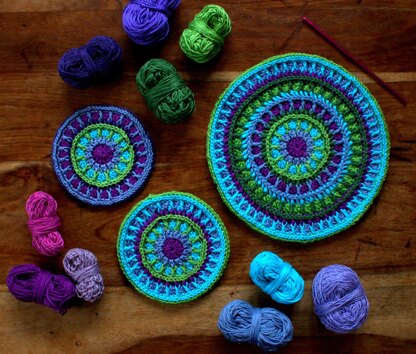 Energy Mandala is a great quick project that gives the maker a wonderful opportunity to play with colour and a chance to practice front and back post stitches. The mandala can be made in any yarn and hook and can be transformed into brooches, wall decorations, coasters......anything you like.