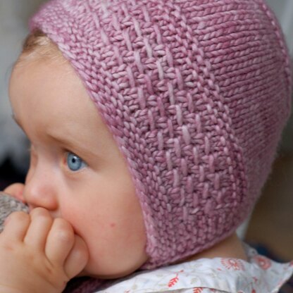 CONSTRUCTION: This bonnet is knit seamlessly. The front of the bonnet is knit flat, featuring an easy textured stitch; the crown is knit in the round after the back neck is finished by a three-needle bind off. An applied I-cord and I-cord ties are worked on the neck portion, then an applied I-cord is worked around the front to cinch in the fit around the face.