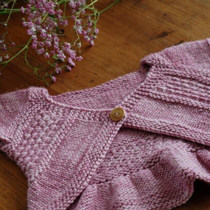 Adorable seamless shrug that knits up in no time and uses very little yarn… Features a fun and easy textured pattern. Both the heartwarmer style and the textured stitch made me think of the “entrechat,” a ballet jump where the legs cross each other mid-air in a flutter. This shrug is knit seamlessly from the top down to the armpits. The raglan cap sleeves are then bound off and the back stitches are worked together with stitches picked up along each front raglans to form the body in one piece.