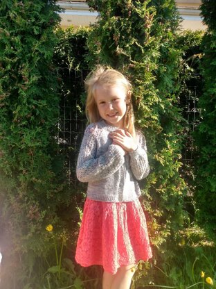 The cardigan is made top-down, starting with neckline ribbing. Short rows are used to make a longer back. Raglan increases are worked on front and back, while increases in sleeves are part of the lace stitch pattern. Cardigan has a classic fit with a 3-4 in / 7-10cm of positive ease for the body. Lace is continued through the entire sleeves. The button band is picked up last and knitted in the same broken ribbing as the neckline.