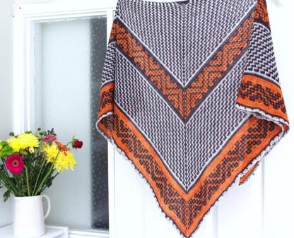 Erstwhile is knit from the top down using only knit and slipped stitches to create a multitude of meandering paths and bold patterns down the length of the shawl.