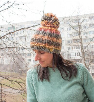 Esen is a squishy, bulky, fast and easy hat, worked from the bottom up in the round, using garter and textured rib stitch.