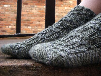 Reminiscent of etchings in jade, these elegant and deceptively easy-to-knit socks are a quick knit in soft, sturdy Handmaiden Casbah. They also use up very little yardage, and are perfect for smaller skeins of sock yarn.