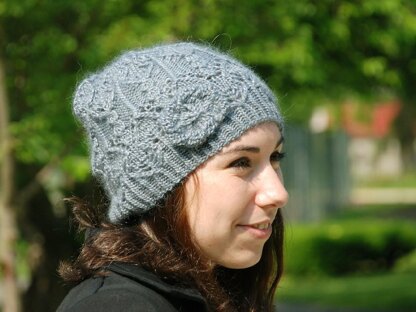This lovely detailed lace hat has leaves and vines and is embellished with a large knitted flower cloche style. The silky soft Astral is perfect for this sweet warm hat.