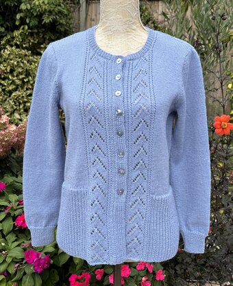 An elegant cardigan with a hint of vintage chic. The set-in sleeves and distinctive deep ribbed welt are designed to flatter the figure. Pretty lacy panels run up each front edge and are framed with a raised twist detail. Matching panels are also worked up the centre back. An effortlessly timeless addition to any wardrobe. Worked bottom-up and with full written instructions.