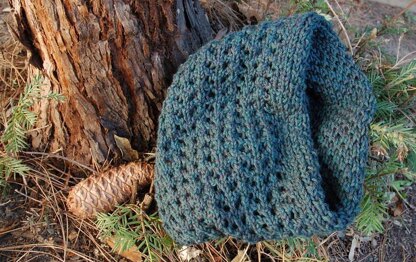 This snuggly, close-fit cowl is knit in the round and kitchener stitched closed at the end. Lace and texture combine to create a warm, scrunchy piece that's fun to wear!