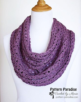 This pretty scarf has two views, one side looks like raised rows that resemble knitting and the other side more like clusters of puff stitches. Both are very pretty. The sizing is easy to adjust and the simple stitches make this go very quickly.