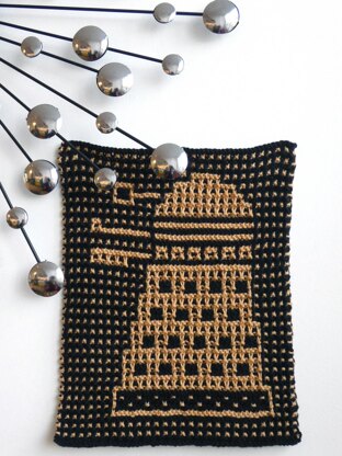 This Dalek-inspired washcloth is perfect to help you exterminate germs around your home. Instructions on how to knit using the mosaic technique are included in the pattern. The design is fully charted using Stitchmastery software.