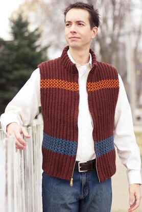 This front-zippered men’s vest is created using a reversible, textured, yet easy-to-work pattern stitch, the fluted rib. The stitch creates softly rounded columns (resembling a quilted channel) on one side (Side 1) and a knit rib on a bed of seed stitches on the reverse side (Side 2). Color blocks at the waist and upper chest are created by alternating two rows of accent and main colors. Seamless construction makes this a quick project, great for creating that extra layer of warmth.