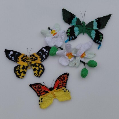 There are three, 8 to 11 cm exotic butterflies included in this pattern: the green peacock, hebomoia butterfly and the false tiger moth . You’ll find the pattern for the 6 cm moon orchid at the end. Each butterfly is a small, easy to medium difficult project to be done in an evening or so, with small amounts of yarns are needed. So a butterfly is a great project to use up any scraps you have lying around.