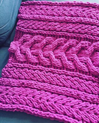THIS IS A LOOP YARN FINGER-KNITTING PATTERN. The Extra-Chunky Staghorn Cable Blanket pattern has a centre pattern of extra-chunky staghorn cables, bordered on each side by smaller staghorn cables and flat twist cables. Staghorn cables are a common motif in Irish Aran knitting. NOTE: While this pattern is written for Red Heart Loop-It yarn, UK knitters can substitute Lion Brand Off The Hook Yarn for a blanket of approximately the same size.
