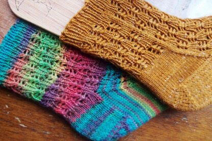 This is the adult sized version of “Contrary Cockleshells" from my book Tiny Treads. For this version there is a choice of working top down or toe-up. Both versions have a heel flap but there are slight differences in the way the pattern is set-up to allow for smoother working for that particular construction.