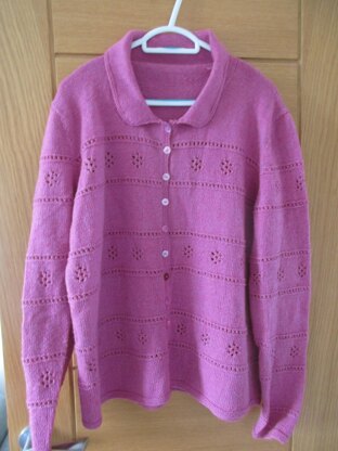 This is a pattern for an eyelet flower cardigan, originally designed for Scheepjes. It is worked in stocking stitch with bands of eyelet flowers, ridged eyelets, a rounded collar and garter stitch edges.