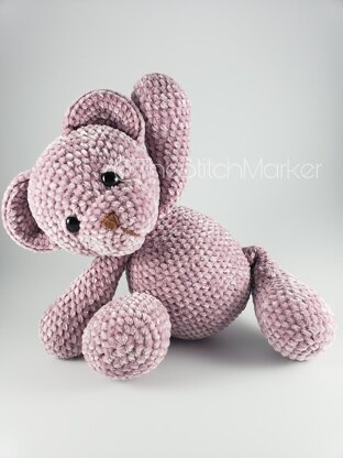 The size of your Ezi bear will depend on your yarn and the hook size you use, mine is 9.5in/24.5cm sitting and 13in/33cm stretched out, he was made with Lion Brand Vel-Luxe yarn in Lilac and a 4.5mm hook.