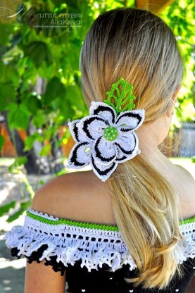 Yarn: Omega Perle #5 (100% cotton/50 g (1.75 oz)/178 yd): #501 white - 1 ball, #502 black - 1 ball, #529 lime green - 1 ball. NOTE: Many flowers and leaves can be made from a single ball of yarn.