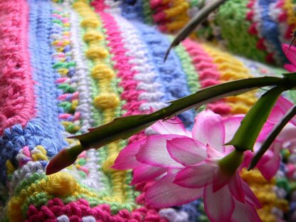 This afghan is done in a bright color palette that invokes the thoughts of Faeries flitting about the woods. Bits of sparkle keep it bright and ethereal. You can use the colors chosen by me, OR you can use scraps to make this a one of a kind creation.