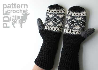 Keep your hands (or someone else's) warm this winter with these extra thick and cozy crocheted mittens! This do-it-yourself pattern includes instructions to create the Mens Large (8.5” from wrist to fingertip; 9” hand circumference; 5” cuff) pair of mittens. Crocheted using a split single crochet stitch (ssc), the smooth v's of the textile are reminiscent of a smooth knit stockinette stitch. These written instructions include color work charts and photos for pattern clarification making it an easy to follow how-to.