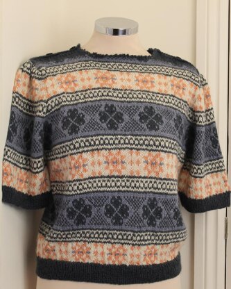 The pattern is for a short sleeved Fair Isle Jumper with a picot edged neckline and button fastenings on the shoulder. It comes in two sizes, small and medium. A total of 6 balls of yarn are needed to complete the jumper, 3 of the main colour and one of each of the other fair isle colours.