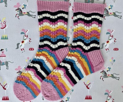 I wanted a stitch pattern that would enhance and emphasise the stripes, whilst also being fun to knit. The Fairground Socks are all of those things, and so much more!