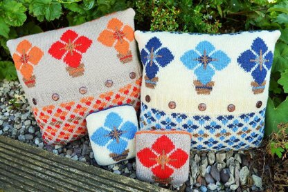 This is my design for a cushion cover and pin cushion using both fairisle (stranded colourwork) and intarsia techniques, inspired by my garden. I hope you like it.