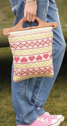 This is a pattern for a fairisle project bag, originally published in Knitting magazine. It has an all over fairisle pattern with a moss stitch top border. It has lining and wadding, with wood look plastic handles that the top border is threaded through. Photos Laurel Guilfoyle for Knitting magazine.