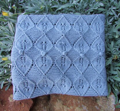 The Fairy Leaves Baby Blanket starts off with a provisional cast on and half of the blanket is knit with the leaves facing one direction and the other half facing the other direction. Both knitted and charted instructions are included in the pattern.