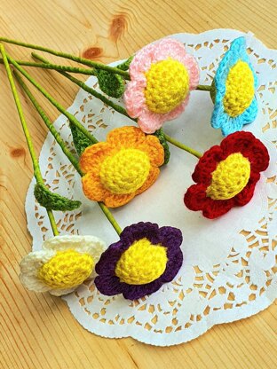 PDF pattern for fairy tale cute quick and easy flowers for home decor bouquet or gift. The pattern includes step by step instruction with pictures for each crocheted part as well as for assembly of the flower. Very easy to follow pattern with pictures. There is one 19 page PDF with pictures for ease of understanding. The pattern uses size 2 baby weight yarn. You can use different colors for a completely different look. If you have any problem using or reading this pattern please feel free to contact me I will be more than happy to help.