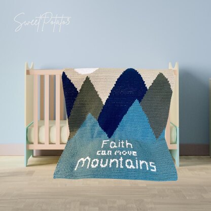 Crochet a baby blanket with the ever-popular mountain theme. This design also featured the "Faith can move Mountains" quote along the lower portion of the blanket. The clean lines in the blanket give it a modern look that will be the feature in any nursery.