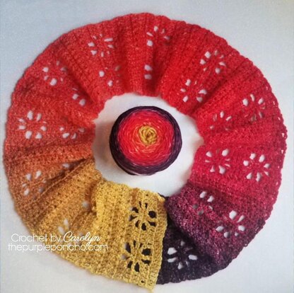 This is so pretty featuring several lace flowers throughout the design which are framed by the solid sections made in basic crochet stitches. This uses only one skein of yarn, or 280 yards, and has beautiful color changes throughout.