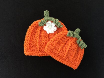 Crochet these adorable pumpkin hats for the entire family! Seven (7) sizes included in this pattern; starting with NB 0-3 month all the way up to adult size. Quick and easy pattern is gender neutral. Flower pattern is included to add a "flare" to a girl version. One skein of Red Heart Super Saver can produce a few hats.