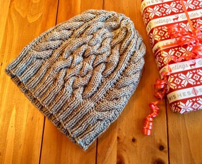 This bottom-up cabled hat has directions for 2 Adult sizes. Made with luscious Tosh Vintage in color Fallen Cloud, it can be made using any worsted weight yarn.