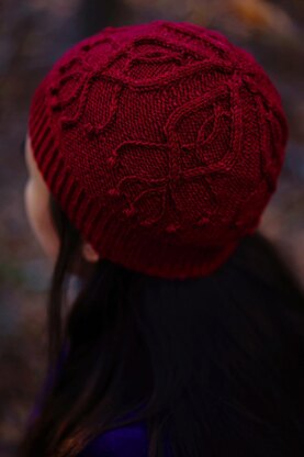 Fallen Embers sprang out in a sudden moment of inspiration while I was contemplating what to do with a single, special skein of yarn. During my teen years, Fallen Embers by Enya was one of my favorite songs and my mind’s eye connected it with the deep red shade of my special yarn. I envisioned a shower of falling sparks and an intricate star motif formed by interlacing cables and twisted stitches. I hope this design will inspire you to break out your own special skein and create something to wear and love.