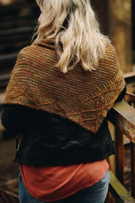 The triangular shawl is knitted from one end to the opposite long edge in plain garter stitch, striped in yak and mohair. A curved edge features a cable on garter background.