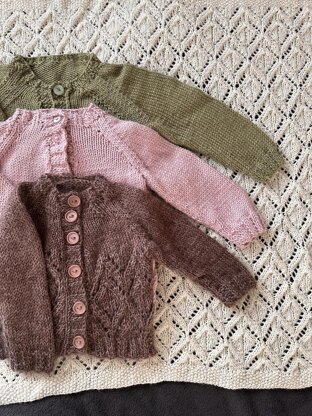 A lovely baby cardigan featuring repeating diamond motif. The cardigan has raglan sleeves and button fixing. The button bands and neck bands are worked at the end. Worked from the bottom up, held on stitch holders and sewn together at the end, it uses DK or 8ply yarn.