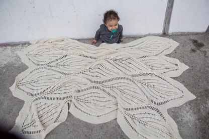 A generously sized blanket that could be used on a smaller bed, or kept on the couch. It is knit in an original lace pattern that has a very large motif. The stitch is mostly intuitive and easy to follow.