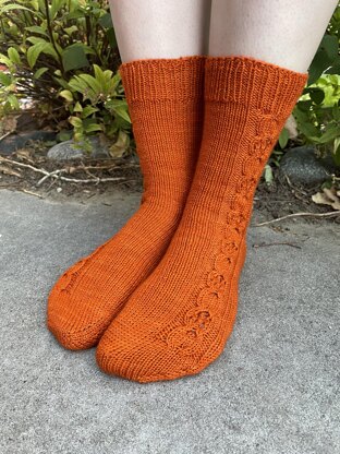 This pattern is all about fall and pumpkins! The sock has a cabled pumpkin motif that runs up the outside of the front of the foot/leg. It is placed on opposite sides, so the pattern is written for a left sock and a right sock.