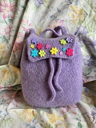 When I first wrote this felted backpack pattern, my daughter was 6 years old and wanted to pick her own colors and style. This was at the height of the felting and fun fur craze, so a purple and pink backpack was designed and worn to everyday of first grade.