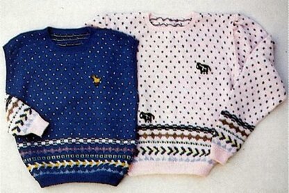 Put an easy fair isle together, and add an animal sort of like your own logo, and you have the cutest sweater ever! Easy graph for cow or duck. Graphs also for the limited fair isle to make work easy. Knit up either the vest or the pullover with gathered top sleeves. These are comforting to wear and fun to knit! Fits sizes 36 to 43 inches. Uses sport weight yarns. Knitting needles, US #3 and # 5.