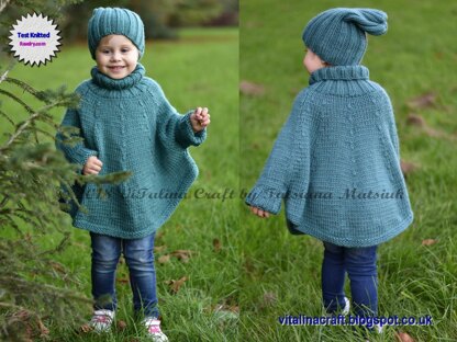 Fascination Poncho and Hat Set is stylish and super cosy clothing for you and your little one. It is designed to keep you and your little one away from wind and cold. Knitted in stockinette stitch this poncho is quick and fancy project. Thick yarn and large size of knitting needles make this project quick and easy to knit. The poncho is knitted bottom up as four parts and collar is knitted in the round before all parts are sewn together. The hat is knitted in the round.