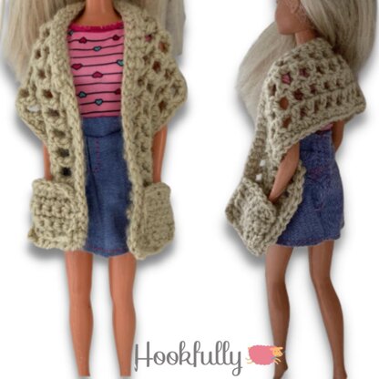 This crochet pattern will help you create a cute pocket shawl that will fit 12” fashion dolls.