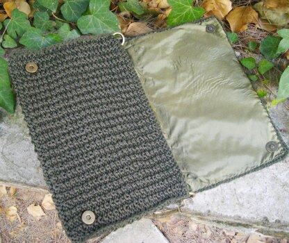 Finished size: 11.5"/29cm W x 7.5"/19cm H, base 11.5"/29cm W x 3.6”/9.5cm H, flap is 6.6’/17cm H Yarn: 100% polyester macramé cord, category worsted, 100gr (3.5 oz)/160 m (174 yds): 5 skeins in dark green. Needles: US 8 (5mm).- Adjust needle size to obtain correct gauge. Hook: US 7 (4.5mm). Notions: tapestry needle, a piece of plastic stiffener 11.7"/30cm W x 19.7”/50cm H, fabric for lining, matching sewing thread, a pair of brass spring ring clasps (inner diameter 20mm), a brass chain 10mm width 47" (120cm) long, sewing needle, sewing machine, 2 magnetic clasps. Gauge: 12 sts x 24 rows = 10x10cm, in bobble pattern with 5mm needles, 16 sts x 26 rows in basic pattern. Level: intermediate