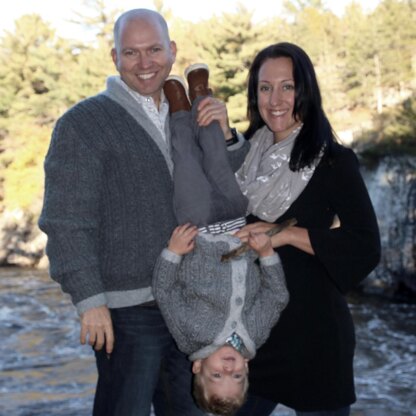 These sweaters are Father and Son designs. The adult version is made in pieces and sewn together. The child design is made from the bottom up, with sleeves made separately and added. Both designs have a button band and collar added and need buttons.