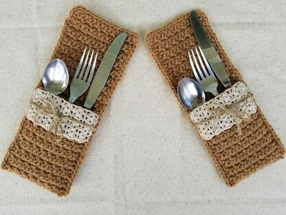 Crochet these Faux Burlap and Lace Silverware Pockets for your next rustic country wedding. Skip the shedding and fraying of real burlap and make something the bride and groom, bridal party or guests can keep forever. They are also an amazing accessory for your own dining table! Make 2 or 500. It's up to you!