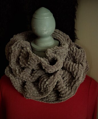 This knitted faux fur cowl has elastic woven through the center to create a scrunchy effect. Knitted in the round with an incredibly soft chenille, bulky yarn. This cowl looks stunning worn loosely or doubled. It is so easy to make. One Size. 34” circum (finished) x 7" wide. Knitting Needles: US 9