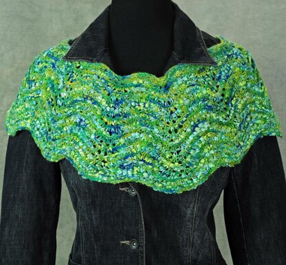 This garment is created with top down construction. The schematic shows a donut shape that is knit from the inside out. Increases are worked to expand the circle’s size. You can make this “Hug” as long or as short as you choose. As it becomes longer it will resemble a capelet or a short poncho. If you want it longer than elbow length the sides will restrict your movement unless you start working the front and back segments separately. You will need more yarn to work this variation. You can choose a single yarn or use multiple yarns and alternate between them, twisting yarns at the back to avoid a hole at the transitions points. Double knitting weight yarns worked on a larger needle sizes create a fabric with enough drape for the hug to hang softly on the body.