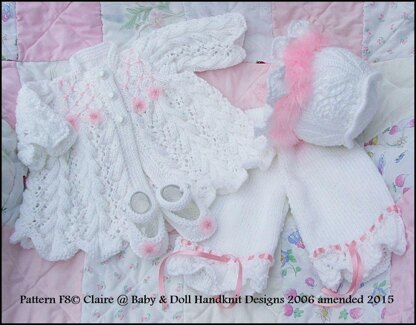 Knitting pattern for a pretty feathered patterned matinee coat with matching 3/4 length trousers, shoes and bonnet. Very pretty and girly.