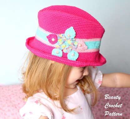 This beautiful stylish hat comes in 3 sizes: Toddler, Child (3-10 years), Teen-Adult Pattern is suitable also for boys but made in different colors and of couse without flower applique :)